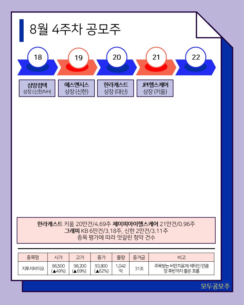 안녕하세요? 모두공모주입니다. 8/17 기준 8월 달력 및 4주차 세부일정 공유드립니다.