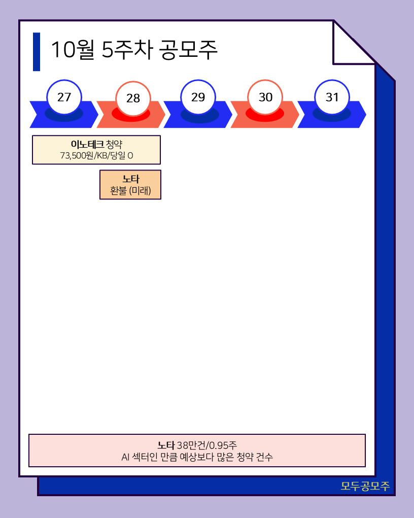 이번주는 이노테크의 청약과 노타의 환불 일정이 예정되어 있습니다. 노타는 AI섹터인 만큼 많은 관심을 받으며 1주 이하의 균등 물량을 나타냈습니다.