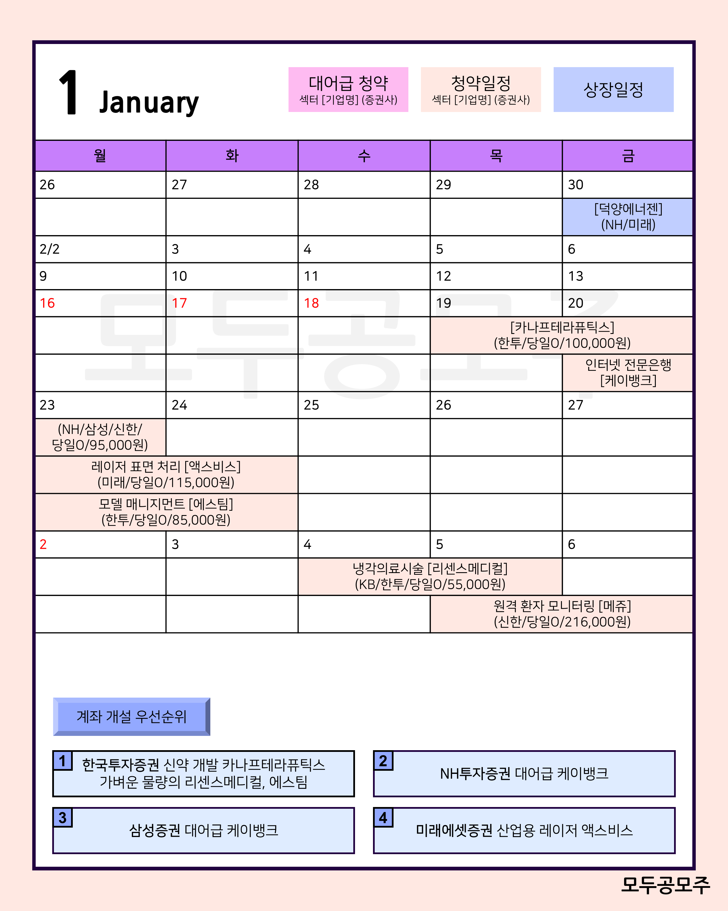 안녕하세요? 모두공모주입니다. 1/24 기준 1월 공모주 달력 및 5주차 세부일정 공유드립니다.