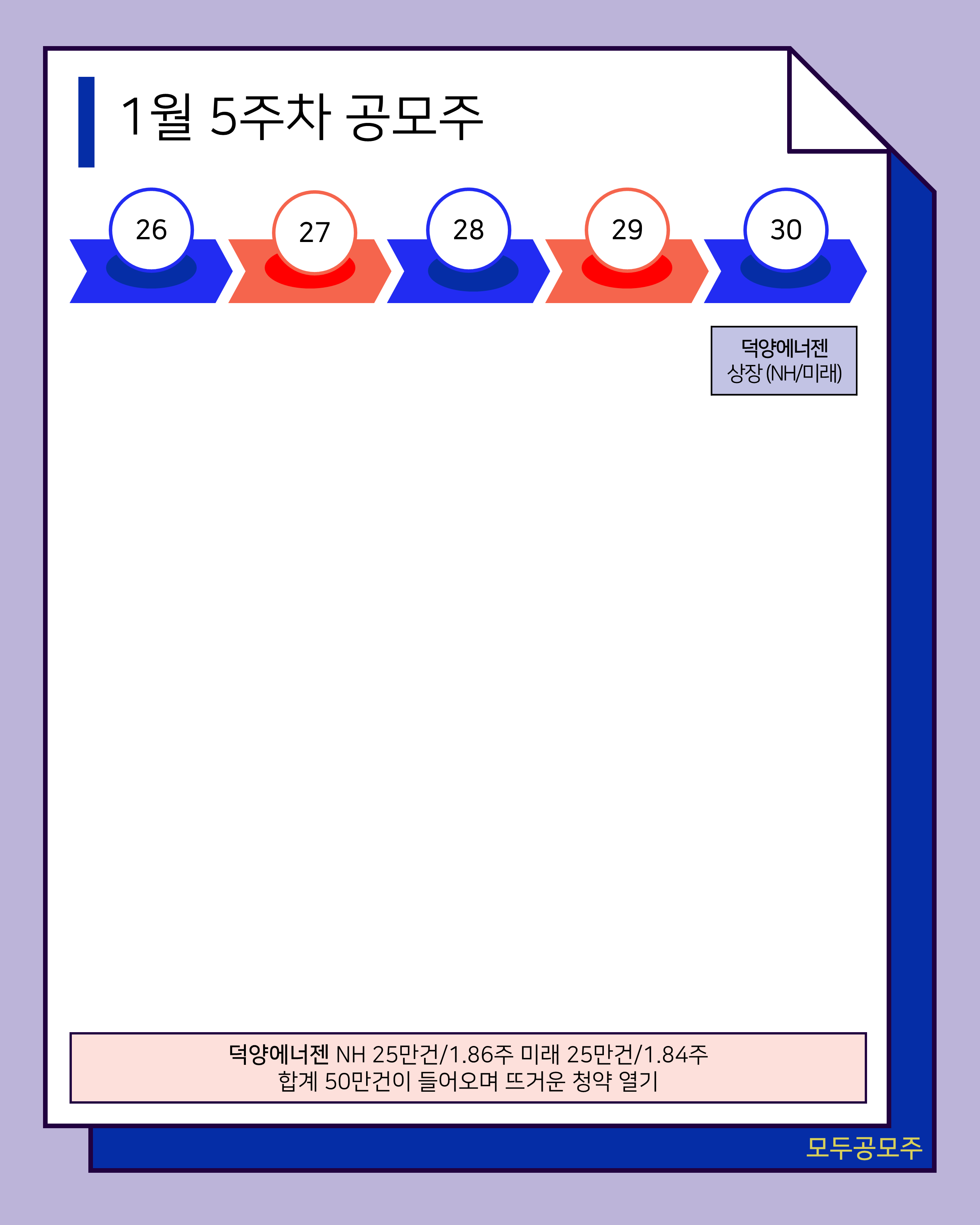 이번주에는 50만건의 청약건수를 기록한 덕양에너젠의 상장이 예정되어 있습니다.