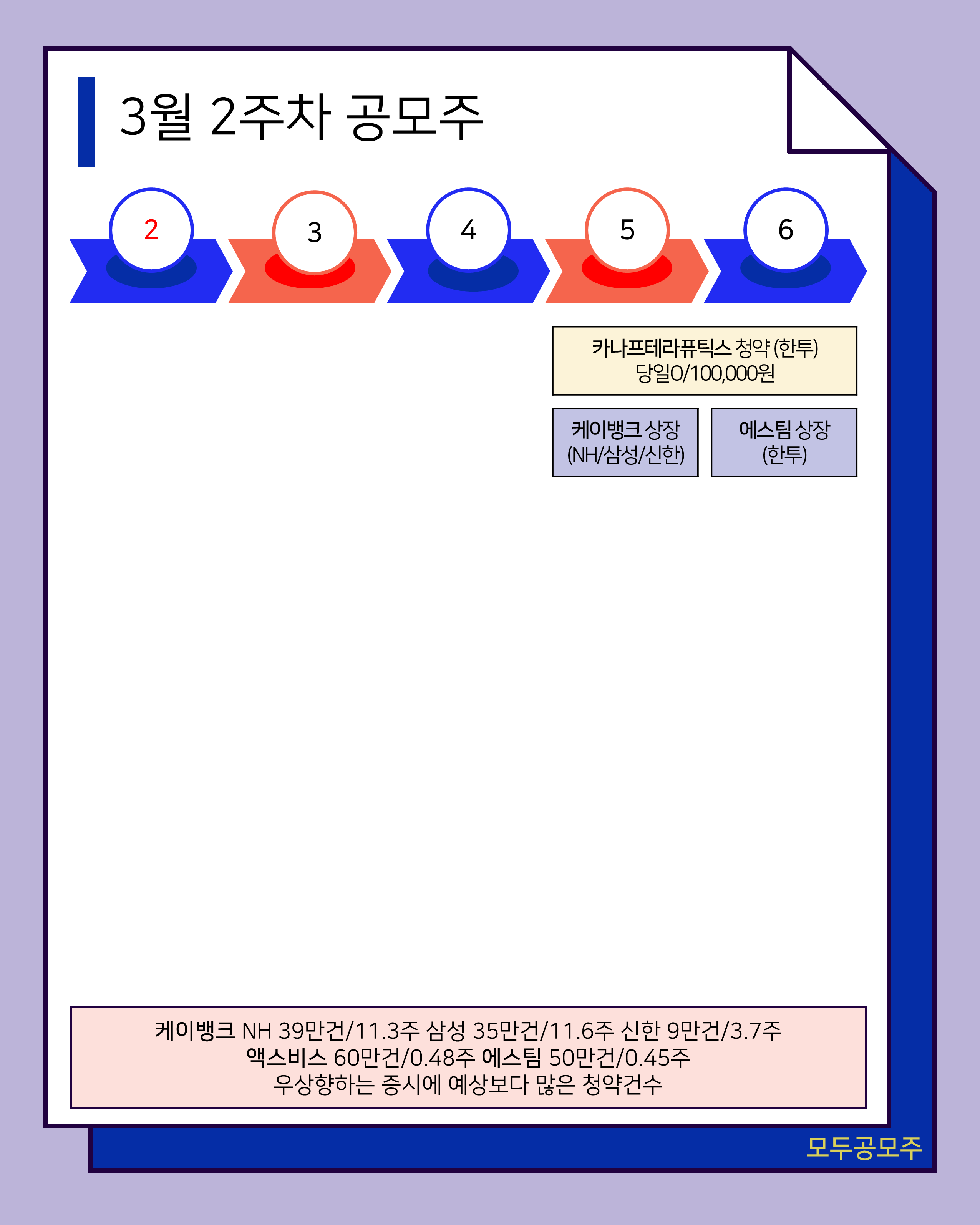 안녕하세요? 모두공모주입니다. 3/1 기준 3월 공모주 달력 및 2주차 세부일정 공유드립니다.